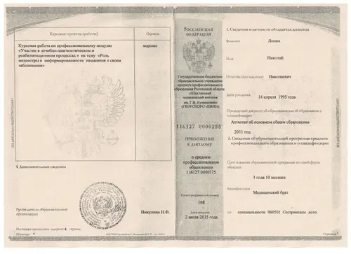 Окончил Шахтинский медицинский колледж им. Г.В. Кузнецовой и Центр повышения квалификации специалистов со средним медицинским и фармацевтическим образованием по направлению - Сестринское дело в наркологии.